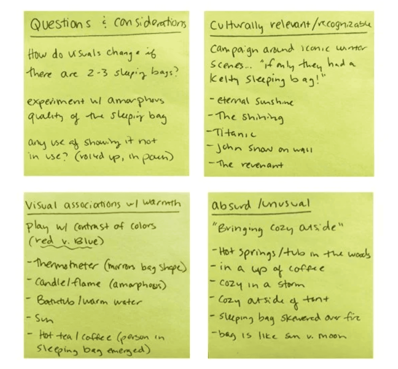 At the campaign level, I’ll think through visuals that I associate with the product or idea. I’ll think of some funny examples, others that feel culturally relevant, and some that feel genuine and endearing.